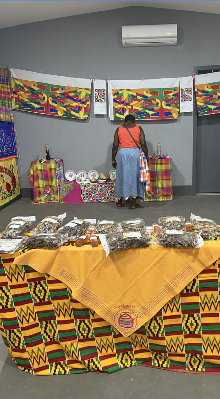 During our stay at the Nkyinkyim Museum, we had the unique opportunity to delve deeper into Ghana’s traditional crafts. We brought traditional fabrics and textiles from Suriname and the Netherlands for the heritage exhibition. This featured techniques and crafts that we, as a diaspora from the interior of Suriname, have preserved. This exchange showcased the vibrant and symbolic Kente cloth and embroidery, which carry a rich history and cultural significance, alongside our own preserved traditions.