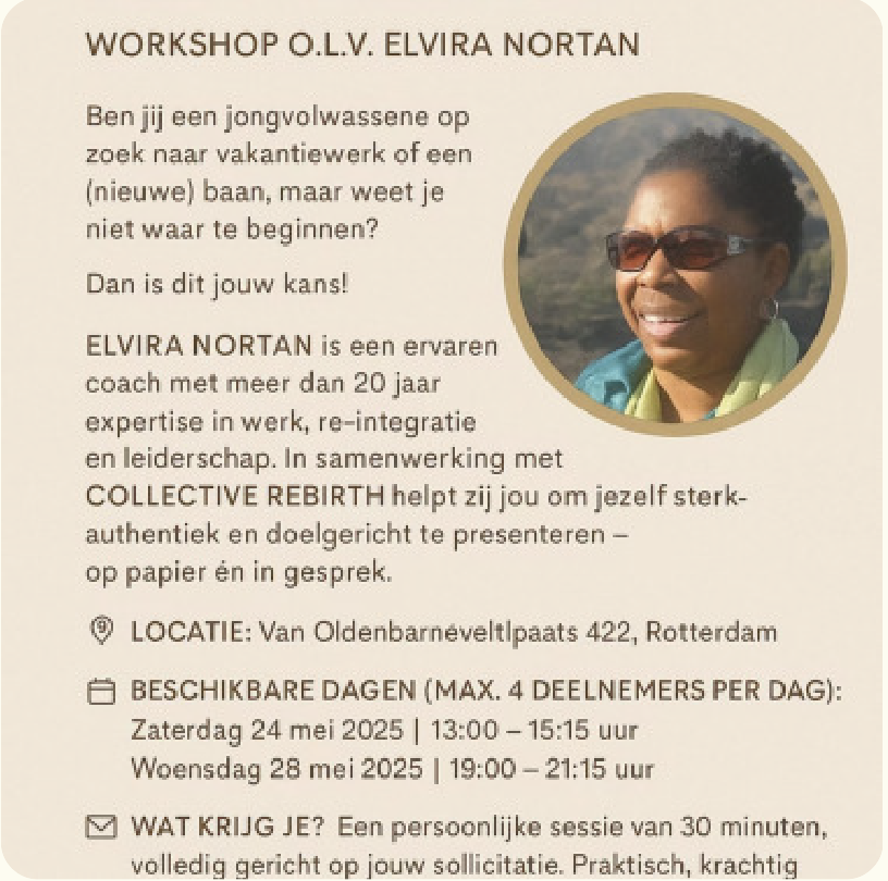 During these practical sessions, you’ll learn essential skills to find internships or new jobs. The available dates are Saturday, June 21, 2025, and Wednesday, May 28, 2025, each day from 7:00 PM to 9:15 PM. To guarantee personal attention, we work with a maximum of four participants per day. There is also an option for 30-minute in-person sessions to further refine your application strategy. Elvira Nortan shares her expertise and offers personal feedback, resulting in concrete improvements in your application techniques.