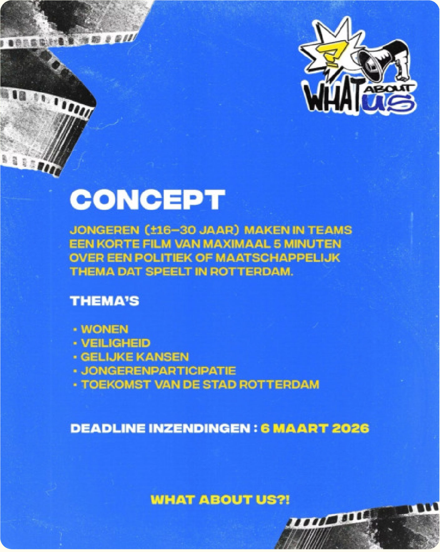 On March 14, 2025, a special project will take place in collaboration with Open Rotterdam: “What About Us?!” – an initiative in which young people (16-30 years old) work in teams of no more than 5 minutes to make a powerful statement about a political or social issue relevant to Rotterdam.